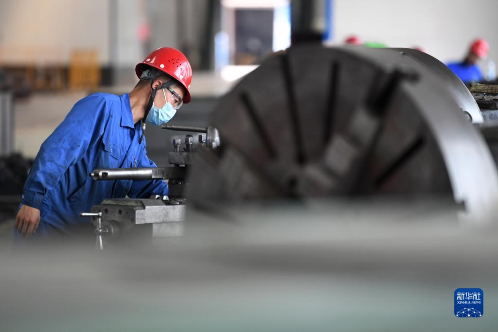 工人在蘭州新區蘭石集團高端裝備產(chǎn)業(yè)園車(chē)間內作業(yè)(8月11日攝)。