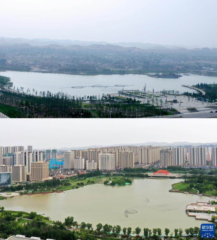 拼版照片:上圖剛剛建成蓄水的蘭州新區棲霞湖風(fēng)光(2013年8月22日攝,蘭州新區供圖);下圖為2022年8月10日拍攝的蘭州新區棲霞湖風(fēng)光(無(wú)人機照片,新華社記者陳斌攝)。