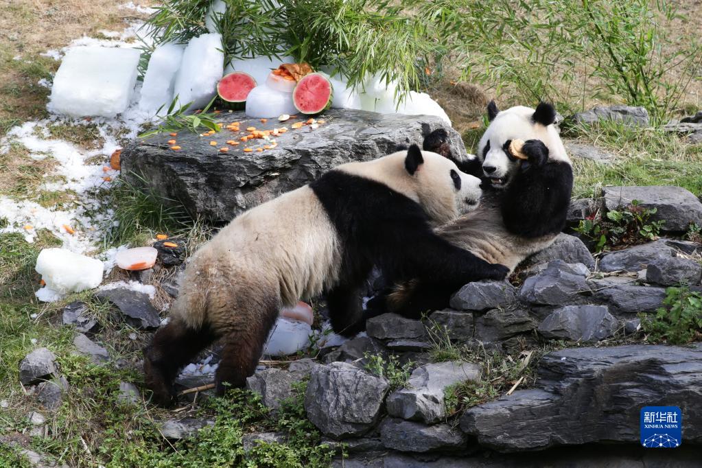 8月6日,在比利時(shí)布呂熱萊特的天堂動(dòng)物園,大熊貓“寶弟”(左)、“寶妹”享用“生日大餐”。