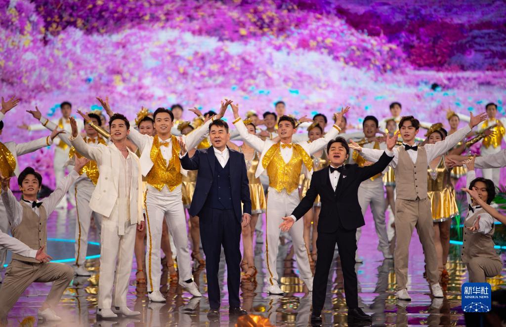 8月12日,演員許魏洲(前左二)、陳建斌(前左三)和王祖藍(前右一)在開(kāi)幕式上演出。