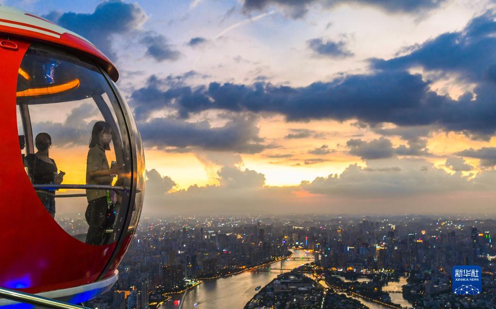 游客在廣州塔頂的戶(hù)外平臺上體驗摩天輪,觀(guān)賞城市落日。廣州塔是廣州城市新地標、潮流打卡地(8月7日攝)。