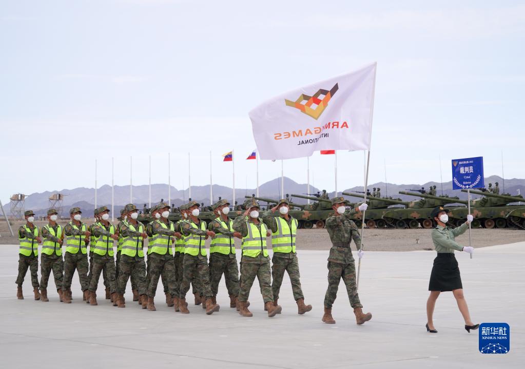 8月13日,“國際軍事比賽-2022”中國庫爾勒賽區比賽開(kāi)幕,裁判員方隊入場(chǎng)。新華社發(fā)(欒鋮 攝)