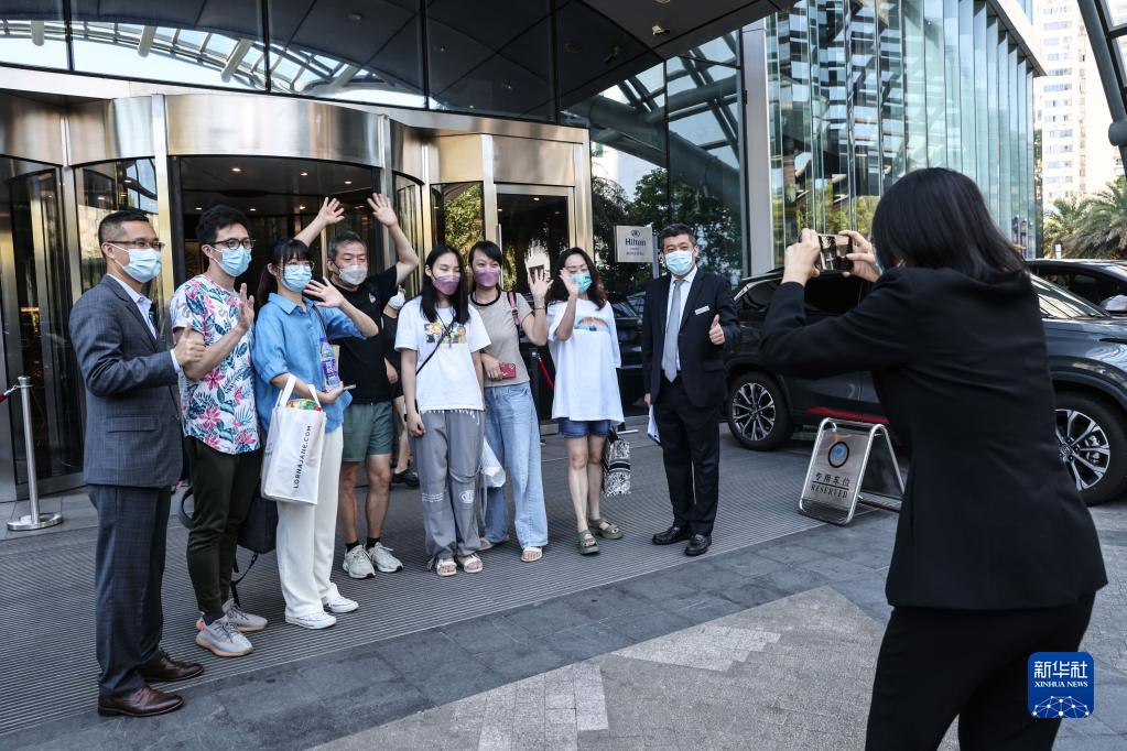 8月14日,準備返程的旅客在??谑旋埲A區一酒店門(mén)口與酒店工作人員合影。