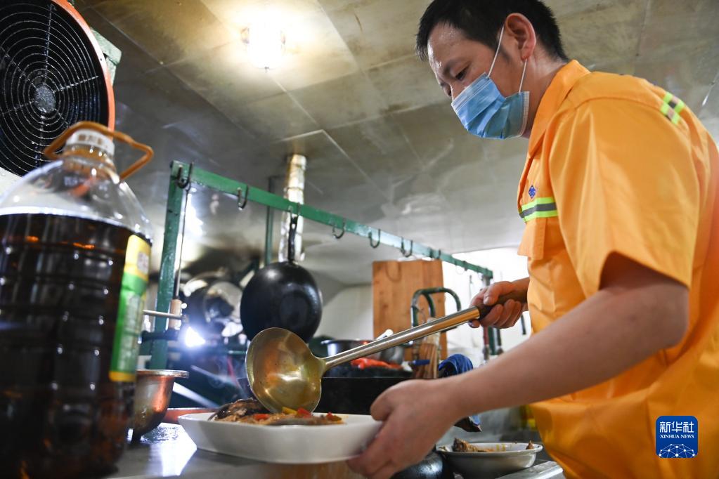 民快輪餐務(wù)員李文春在準備飯菜(8月10日攝)。