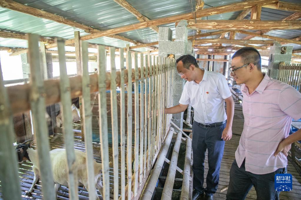 8月11日,在重慶市巫溪縣田壩鎮雙箭村,駐村第一書(shū)記廖正步(左)和駐村隊員在查看牲畜養殖情況。