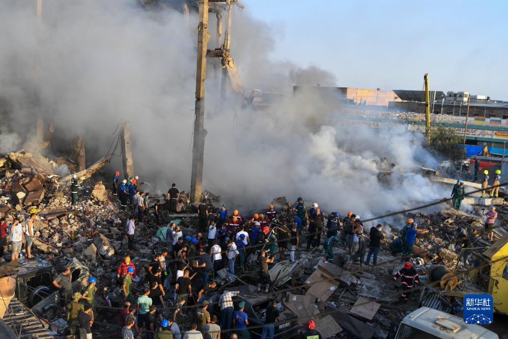 8月14日,救援人員在亞美尼亞首都埃里溫的購物中心爆炸現場(chǎng)工作。