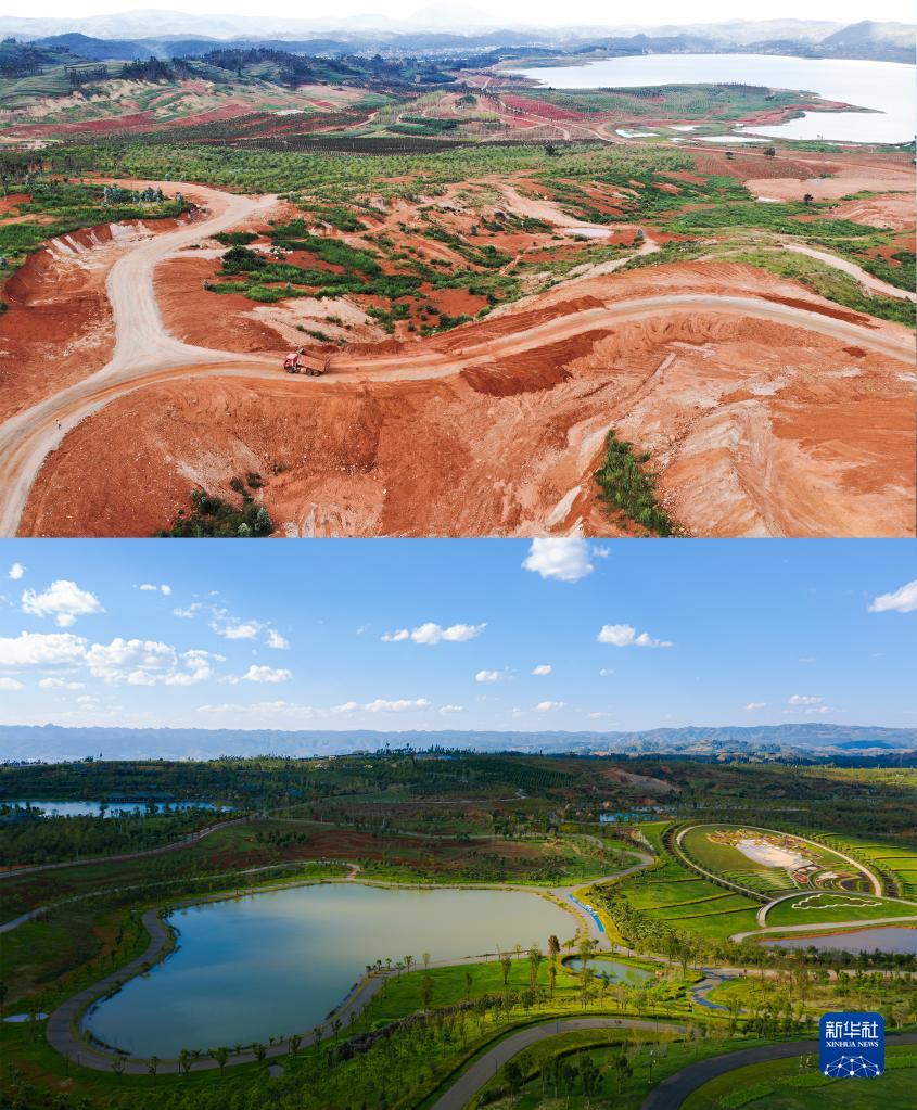 拼版照片:上圖是云南省彌勒市太平湖森林小鎮施工前景象(資料照片);下圖是云南省彌勒市太平湖森林小鎮(無(wú)人機照片,2018年11月10日攝,李昱廷攝)。