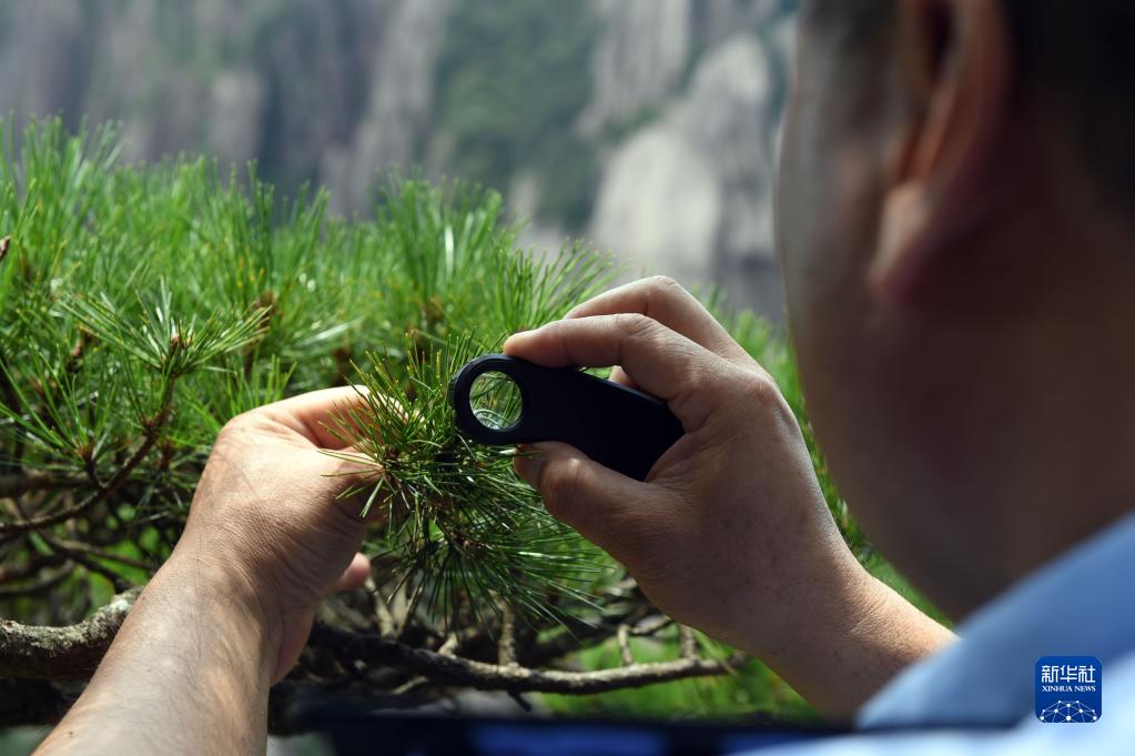 8月14日,胡曉春用放大鏡檢查迎客松的樹(shù)枝和松針,以便及時(shí)發(fā)現病蟲(chóng)害。