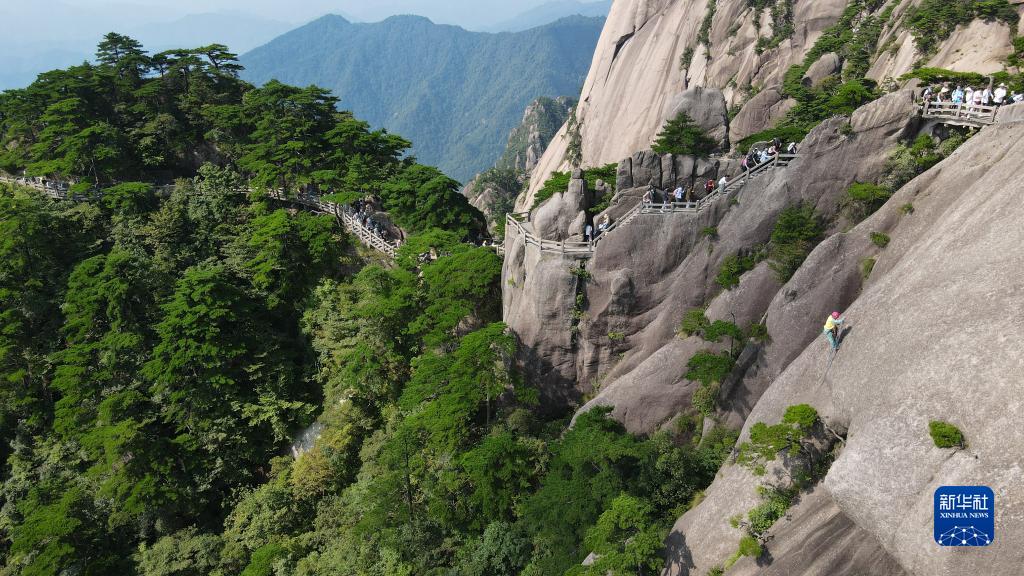 8月15日,李培生在黃山風(fēng)景區的懸崖峭壁間清撿垃圾(無(wú)人機照片)。