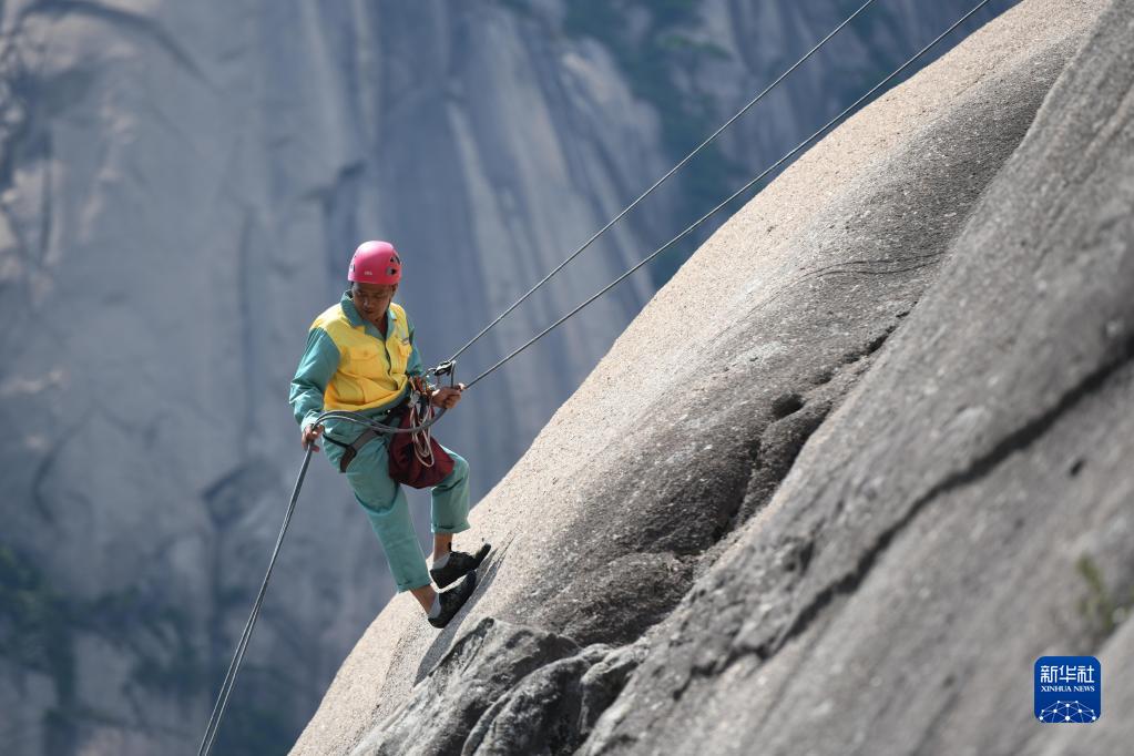 8月14日,李培生在黃山風(fēng)景區的懸崖峭壁間清撿垃圾。