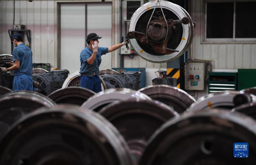 8月16日,廣州機務(wù)段職工在吊運機車(chē)車(chē)輪。