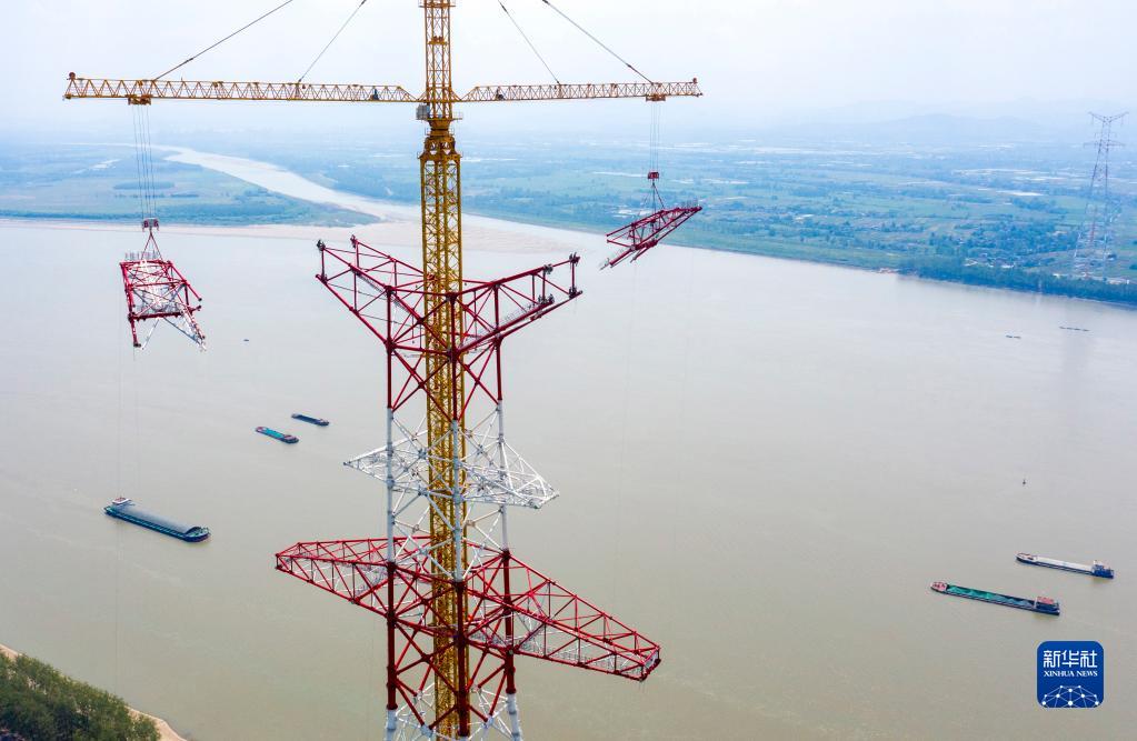 白鶴灘至浙江特高壓直流輸電工程安徽段長(cháng)江跨越塔全部組立完成