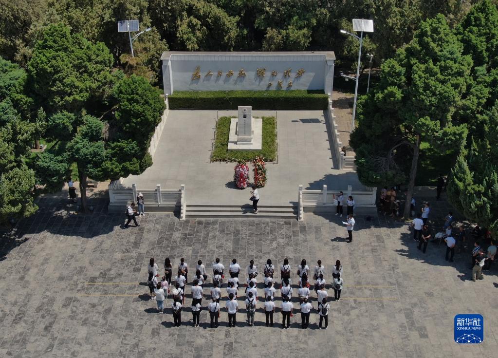 參觀(guān)者在位于河南省蘭考縣的焦裕祿紀念園瞻仰焦裕祿烈士墓(2021年6月24日攝,無(wú)人機照片)。新華社記者 李安 攝