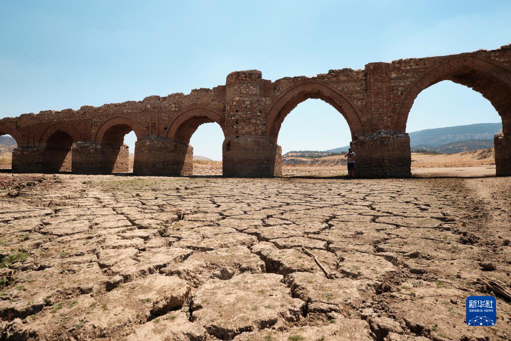 這是8月15日拍攝的干涸的西班牙錫哈拉水庫,上世紀50年代因水庫落成而被淹沒(méi)的梅斯塔古橋重見(jiàn)天日。