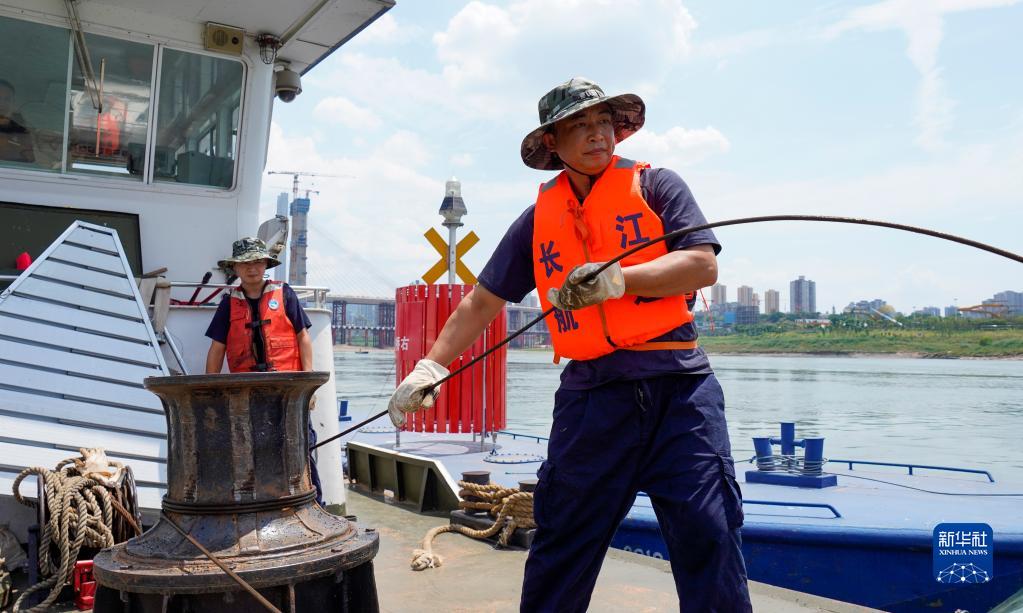 8月16日,長(cháng)江重慶航道局巴南航道處的一名航道工在航道工作船的船頭進(jìn)行航標船錨石起錨作業(yè)。