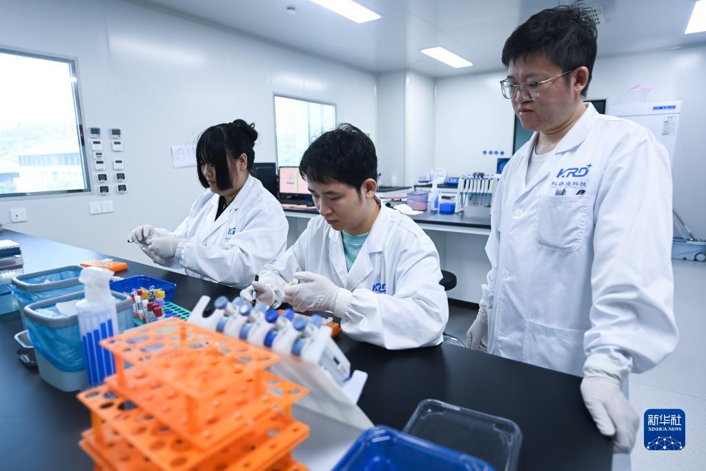8月17日,在杭州科睿迪智檢醫學(xué)檢驗實(shí)驗室有限公司的實(shí)驗室里,檢驗師郭成忠(右一)帶著(zhù)年輕員工做實(shí)驗。這是一家專(zhuān)業(yè)從事醫學(xué)檢測與科研轉化的高科技企業(yè),通過(guò)政府部門(mén)的牽線(xiàn)搭橋,成為當地醫學(xué)院科研實(shí)習基地。