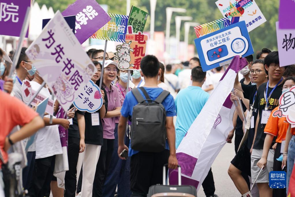 8月17日,在清華大學(xué)迎新點(diǎn),學(xué)生舉著(zhù)院系牌迎接新生入學(xué)。