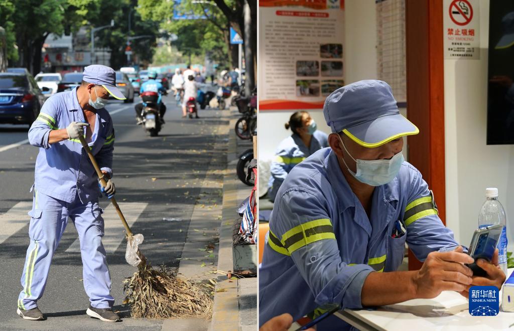 拼版照片:左圖為8月16日上午,環(huán)衛工人楊秀聰在飛虹路上清掃落葉;右圖為8月16日中午,楊秀聰在愛(ài)心驛站休息時(shí)用手機上網(wǎng)。