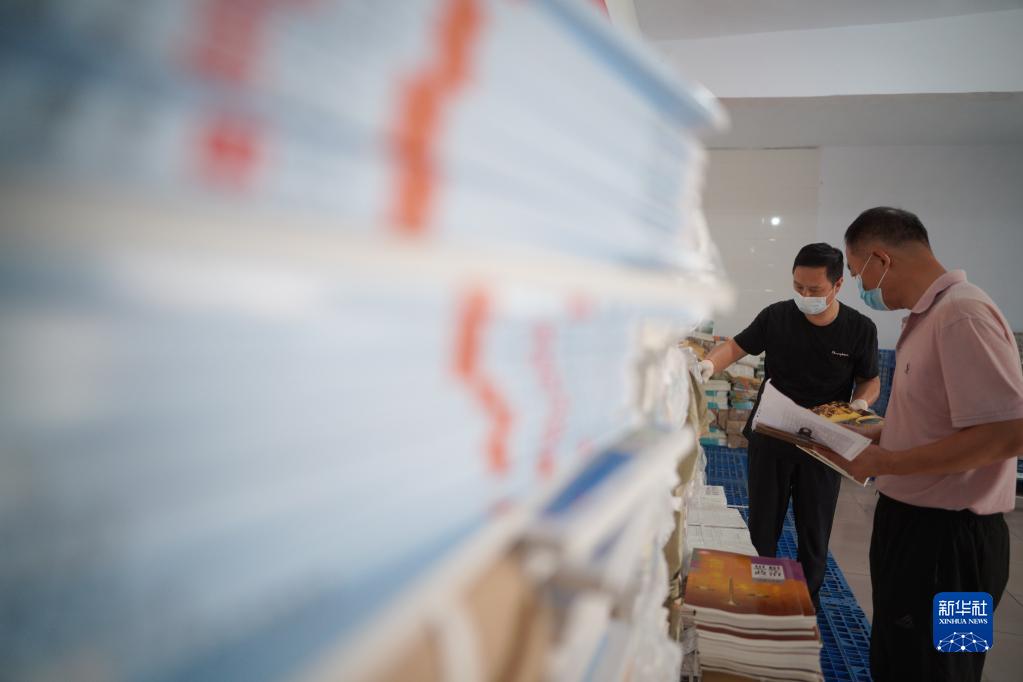 8月17日,河北省邢臺市內丘縣新華書(shū)店的工作人員在倉庫清點(diǎn)新學(xué)期教材。