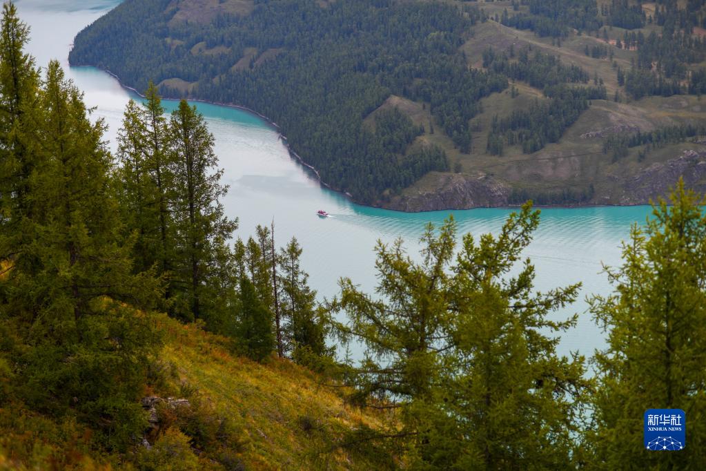 一艘游艇航行在喀納斯湖上(8月12日攝)。