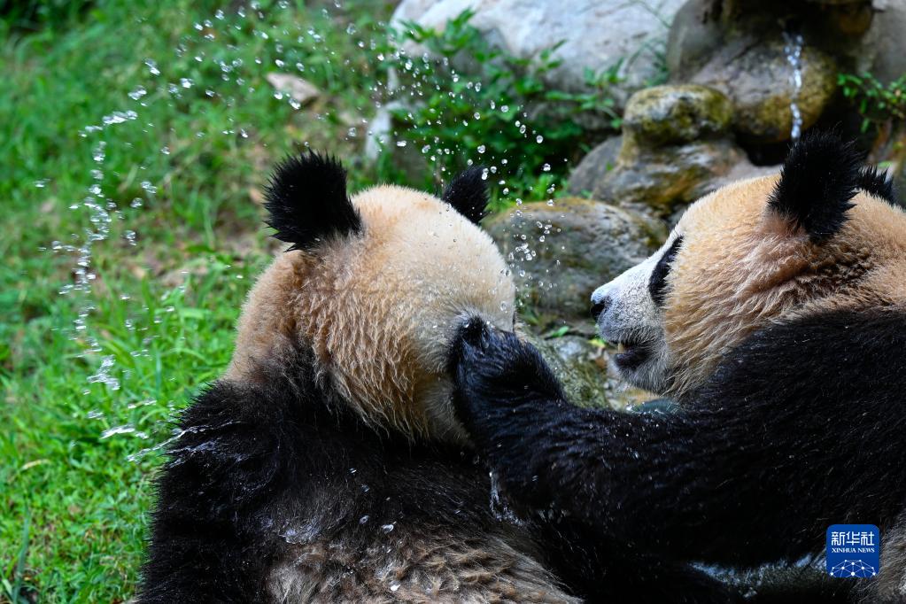 8月18日,中國大熊貓保護研究中心都江堰基地的大熊貓在圈舍的水池里戲水玩耍。
