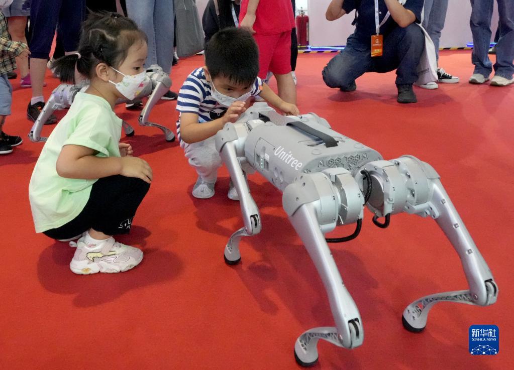 8月18日,兩名小朋友在觀(guān)看“機器狗”。
