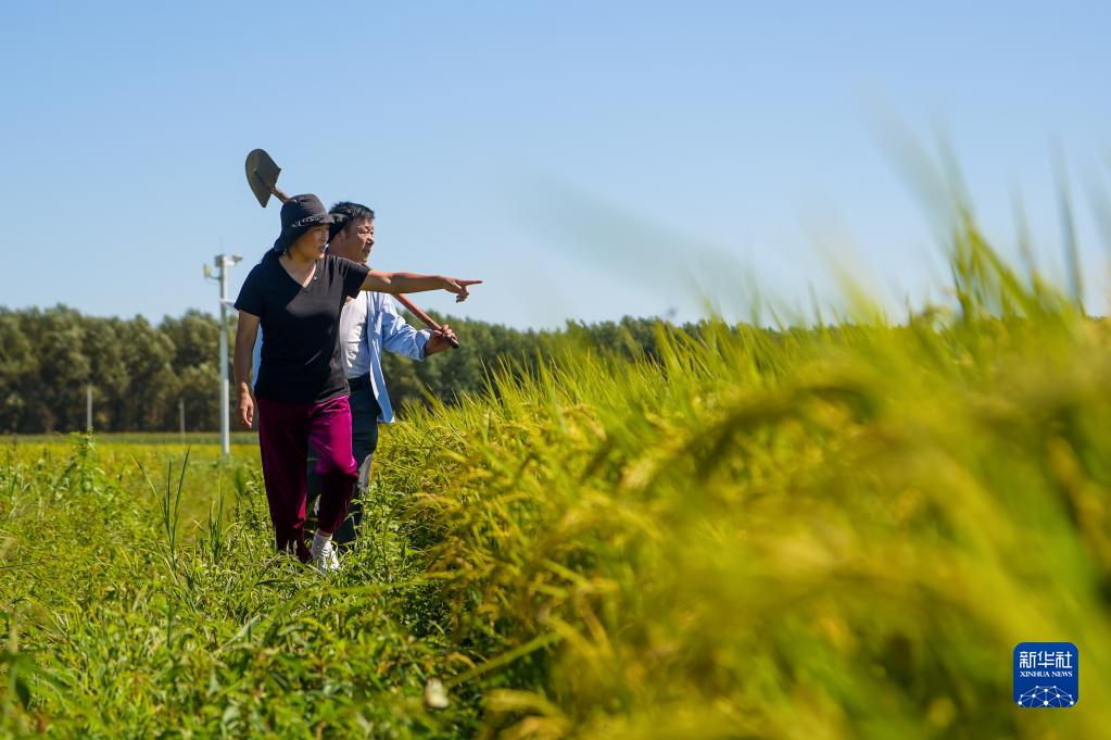 8月17日,在扎賚特旗好力保農業(yè)專(zhuān)業(yè)合作社的稻田,宋春平(前 )查看水稻長(cháng)勢。