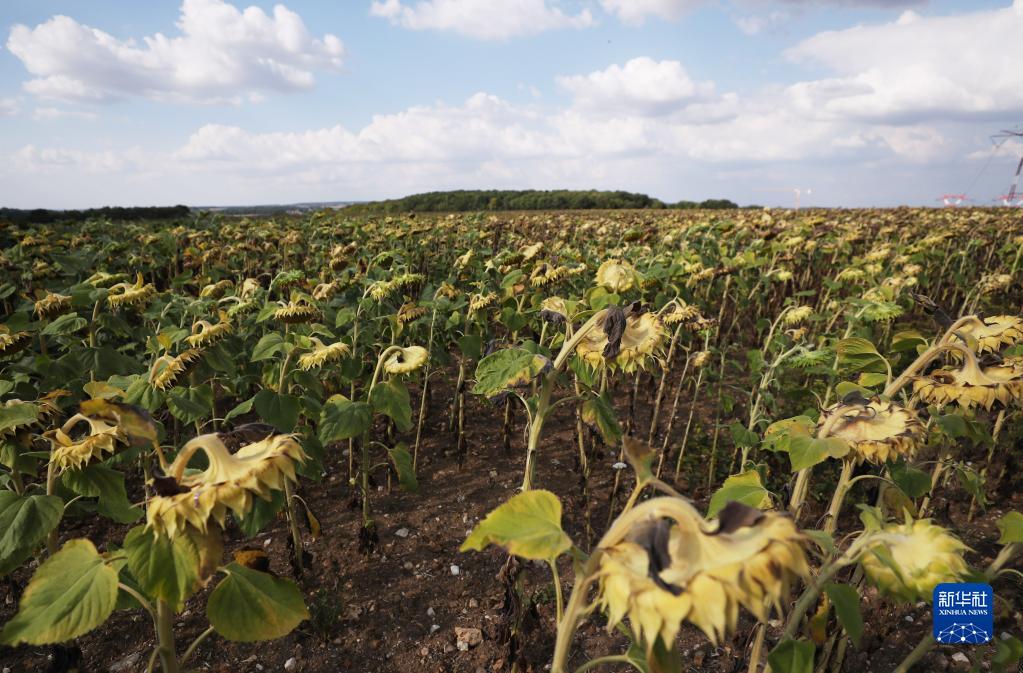 這是8月18日在法國巴黎西北約30公里處的皮伊塞-蓬圖瓦茲拍攝的受旱情影響的向日葵田。
