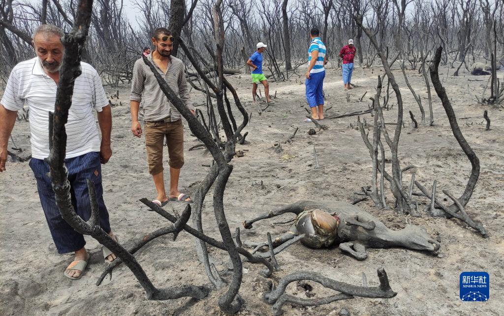 8月18日,在阿爾及利亞泰賴(lài)夫省,人們查看被森林火災燒死的牲畜。