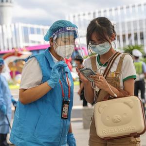 8月18日,??诿捞m國際機場(chǎng)的服務(wù)專(zhuān)員引導滯留旅客查詢(xún)健康信息。