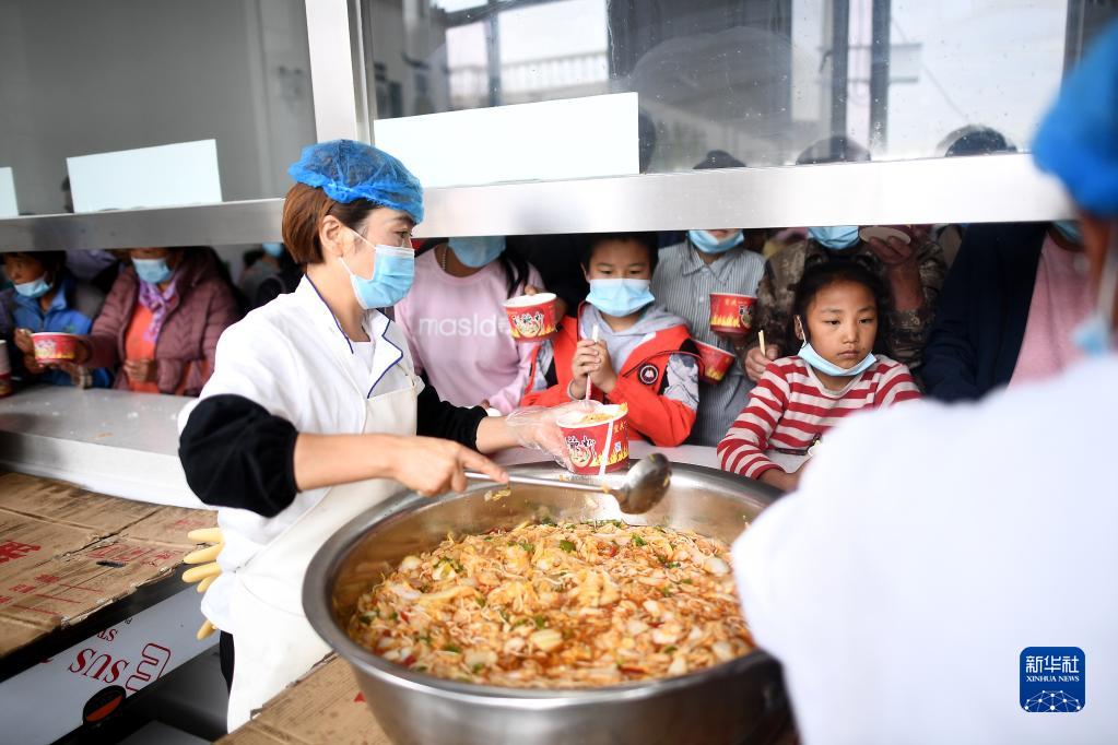 8月19日,工作人員在大通一中受災群眾臨時(shí)安置點(diǎn)餐廳內為群眾盛菜。