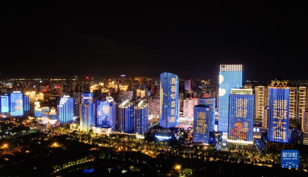8月19日在??谑袨I海大道拍攝的中國醫師節主題燈光秀(無(wú)人機照片)。
