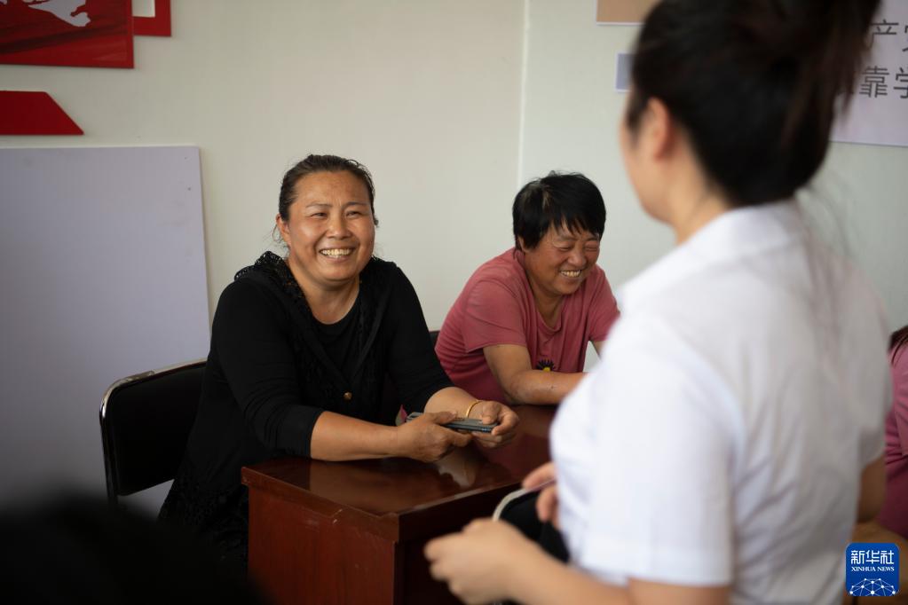 在任村鄉東賈村,村民和碩士宣講團成員李昕瑜溝通(8月19日攝)。