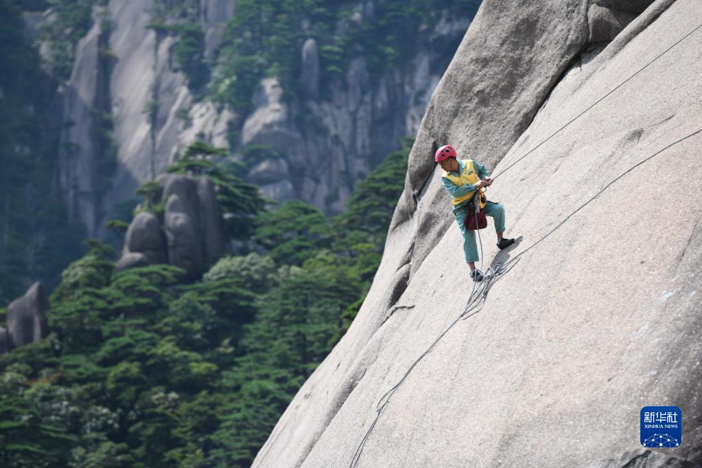 8月14日,李培生在黃山風(fēng)景區的懸崖峭壁間清撿垃圾。