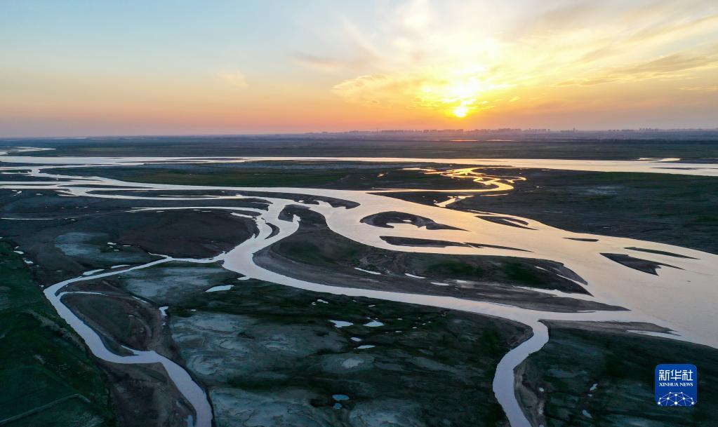 8月16日在內蒙古鄂爾多斯市杭錦旗拍攝的黃河景觀(guān)(無(wú)人機照片)。