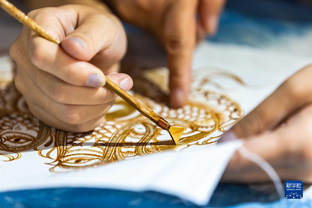 8月18日,張娟娟的母親在蠟染工作室指導張娟娟繪制蠟版畫(huà)。