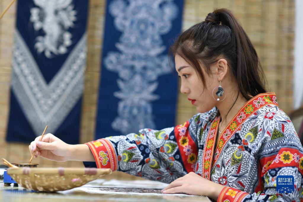 張娟娟在蠟染體驗工作室里繪制蠟版畫(huà)(8月18日攝)。