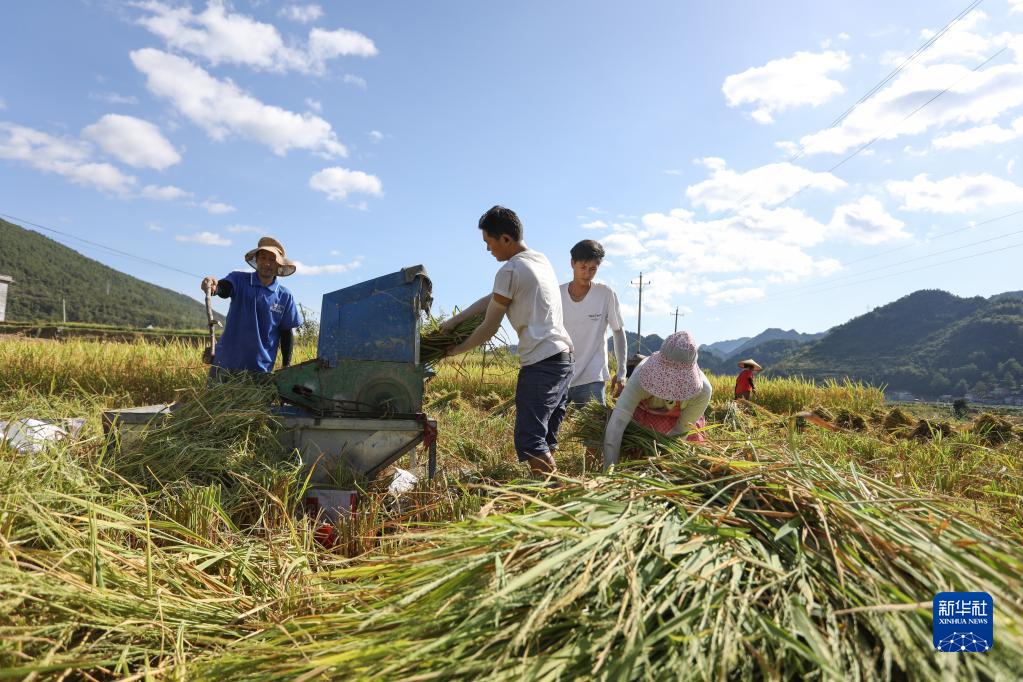 8月22日,村民在重慶市秀山土家族苗族自治縣溶溪鎮一處稻田打稻谷。