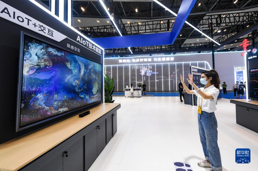 8月22日,記者在2022中國國際智能產(chǎn)業(yè)博覽會(huì )京東方展廳體驗體感交互應用。
