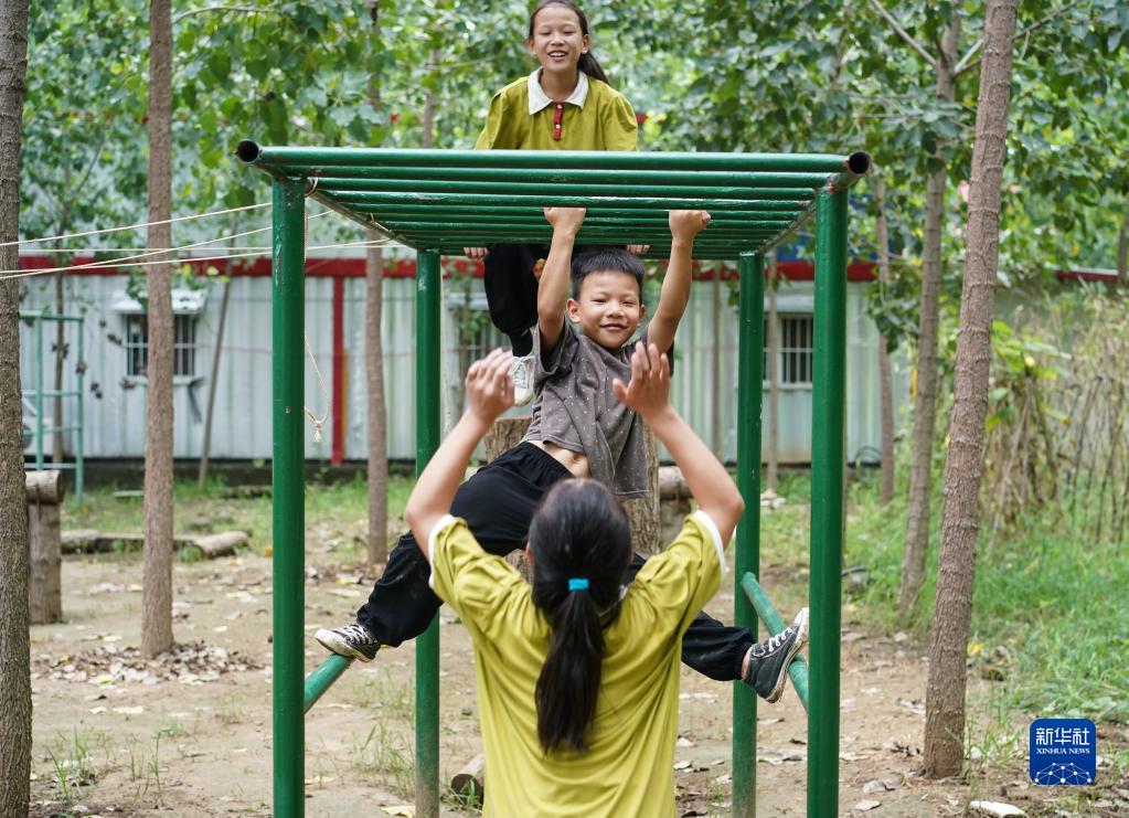 劉龍的女兒劉亦婷、劉亦點(diǎn)(上),兒子劉亦行(中)在練武間隙玩耍(8月16日攝)。