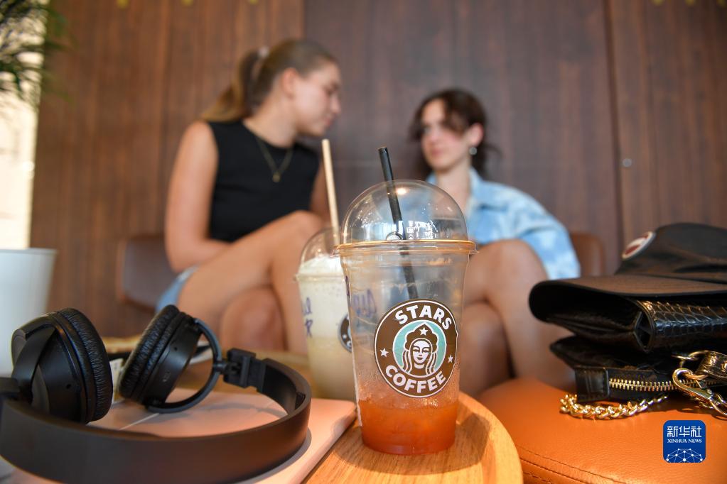 8月22日,人們在俄羅斯莫斯科一家“星咖啡”門(mén)店用餐。