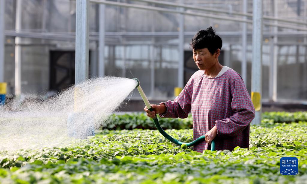 8月23日,山東省棗莊市市中區的農民在大棚內給蔬菜秧苗澆水。