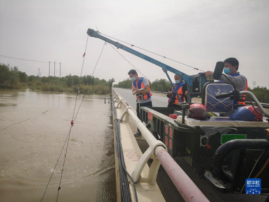 8月23日,巴音郭楞水文勘測局英巴扎水文站工作人員在塔里木河干流英巴扎大橋斷面測量水量。
