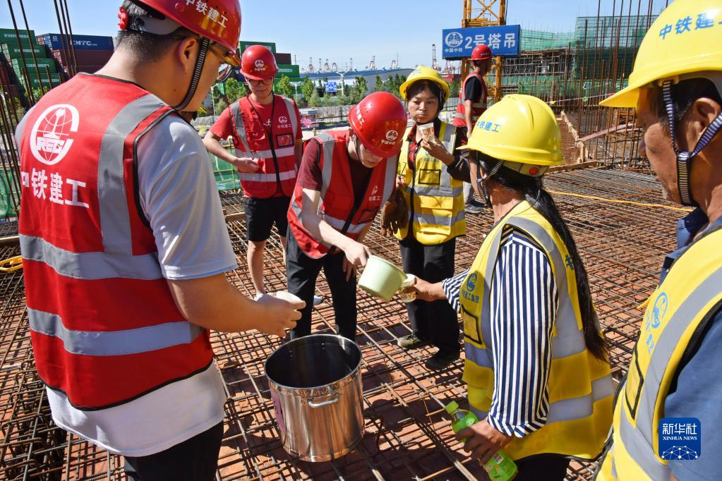 8月23日,青島自貿全球消費綜合體項目部“清涼驛站”的工作人員在工地為建設者送飲料。