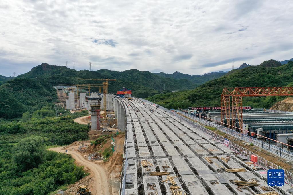 這是8月23日拍攝的首都地區環(huán)線(xiàn)高速公路承德至平谷段四頃地特大橋施工現場(chǎng)(無(wú)人機照片)。 新華社發(fā)(王立群 攝)