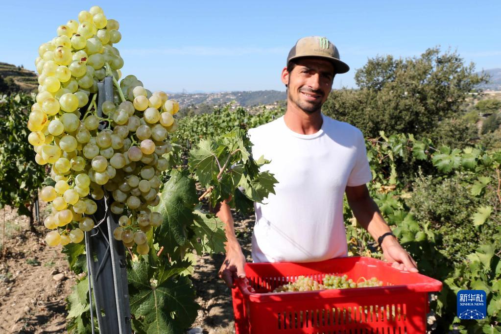 8月23日,工作人員在法國尼斯一家酒莊的葡萄園收割葡萄。