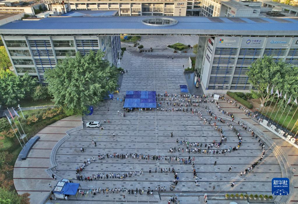 8月24日,居民在重慶經(jīng)開(kāi)區科創(chuàng )中心核酸檢測點(diǎn)有序排隊(無(wú)人機照片)。