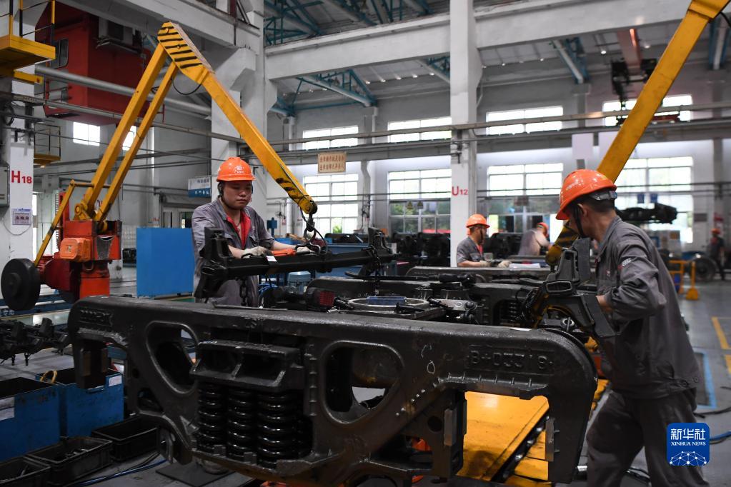 8月24日,在中車(chē)株洲車(chē)輛有限公司轉向架工區,工人在生產(chǎn)線(xiàn)上作業(yè)。