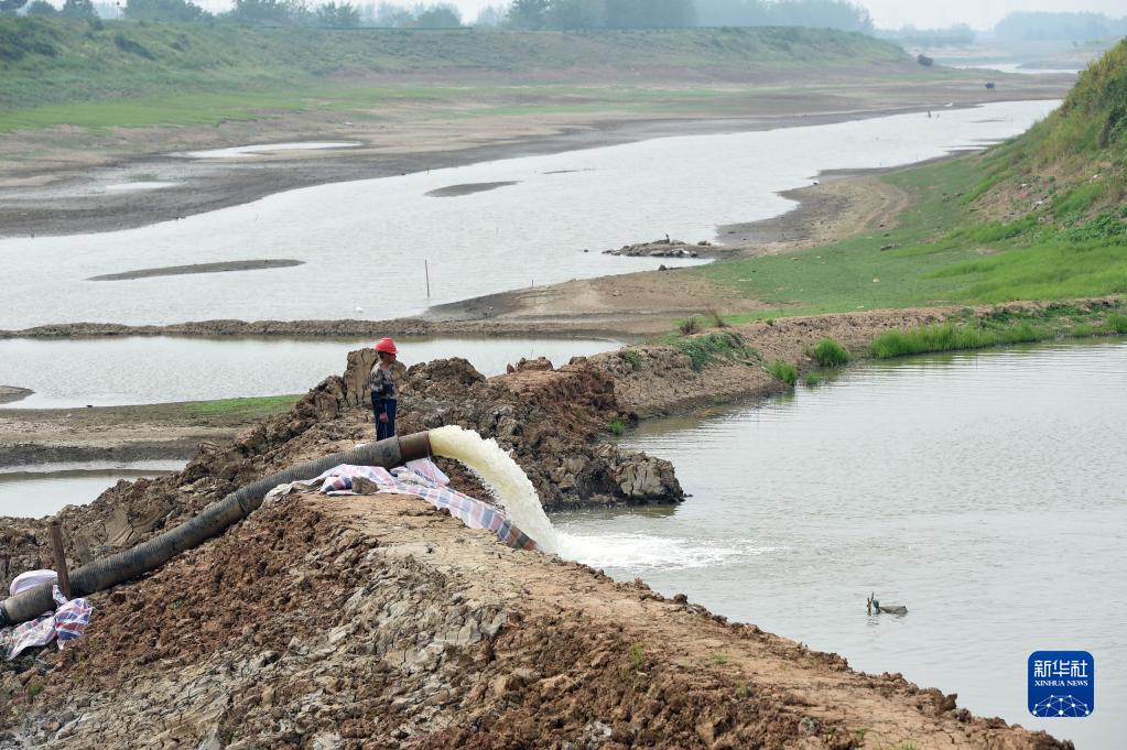 8月23日,在安徽省蕪湖市繁昌區孫村鎮,工作人員在架設的臨時(shí)抗旱站用水泵將河水抽入引水渠道,為農業(yè)生產(chǎn)提供灌溉水源。