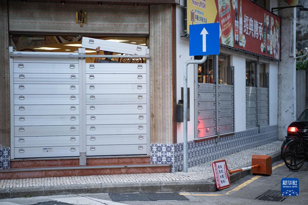 8月24日,澳門(mén)十月初五街一家商戶(hù)工作人員在加裝防水閘。